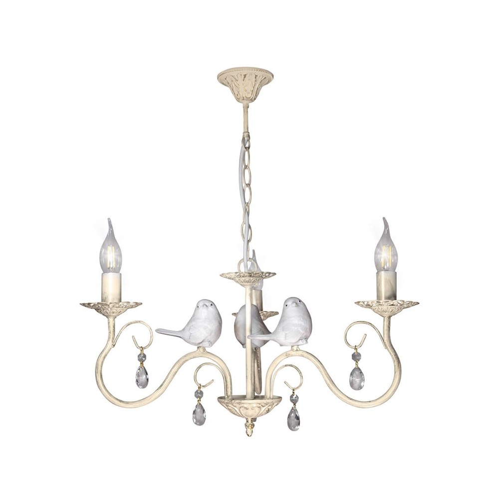 Эта люстра выполнена в нежном бежевом цвете с патиной золота, что придаёт ей утончённый и роскошный вид. Птички и хрустальные подвески добавляют элемент лёгкости и изящества, что делает её идеальным выбором для классических и современных интерьеров.